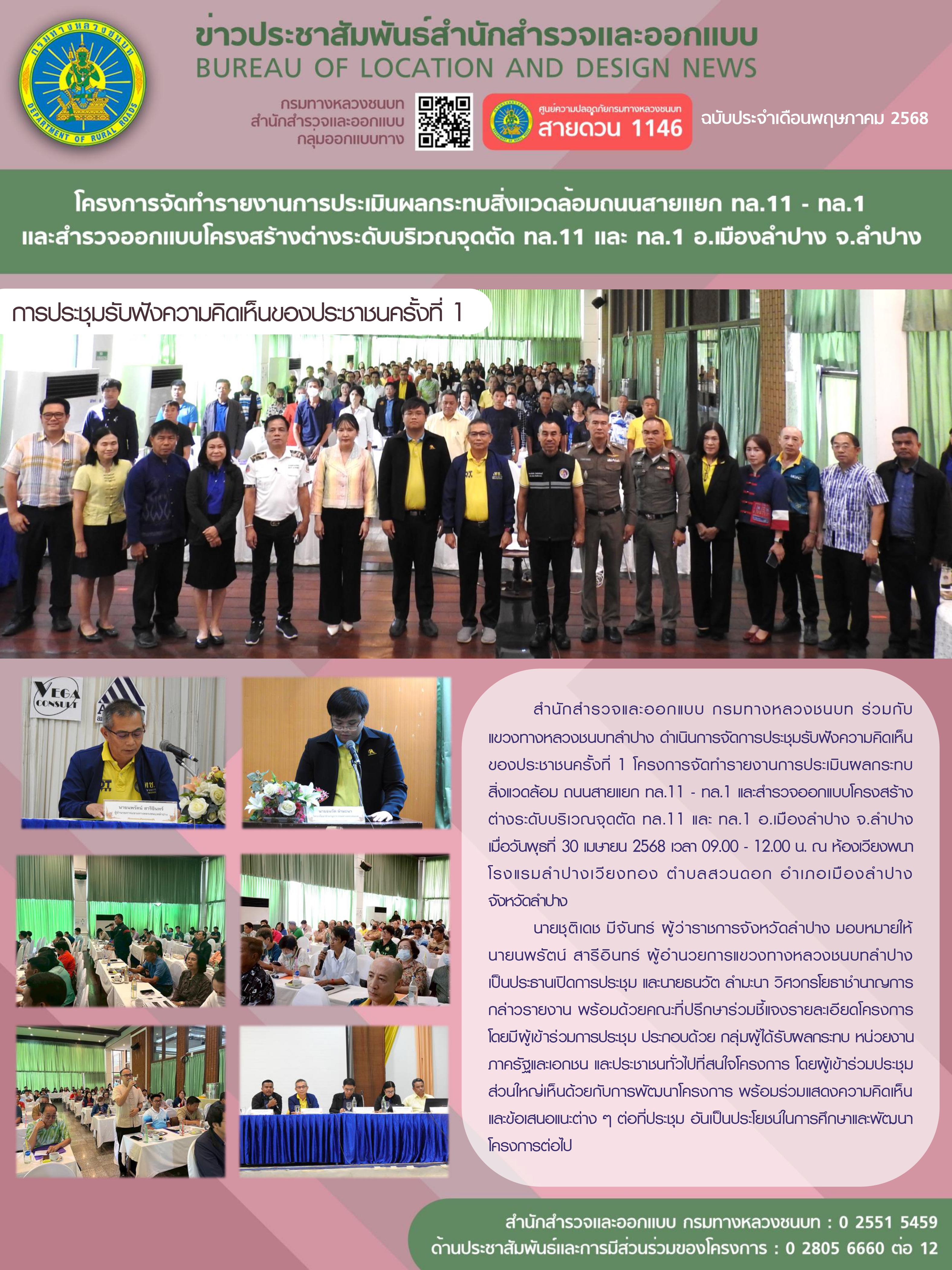 สำนักสำรวจและออกแบบ กรมทางหลวงชนบท ร่วมกับแขวงทางหลวงชนบทลำปาง ดำเนินการจัดการประชุมรับฟังความคิดเห็นของประชาชนครั้งที่ 1 โครงการจัดทำรายงานการประเมินผลกระทบสิ่งแวดล้อม ถนนสายแยก ทล.11 - ทล.1 และสำรวจออกแบบโครงสร้างต่างระดับบริเวณจุดตัด ทล.11 และ ทล.1 อ.เมืองลำปาง จ.ลำปาง เมื่อวันพุธที่ 30 เมษายน 2568 เวลา 09.00 - 12.00 น. ณ ห้องเวียงพนา โรงแรมลำปางเวียงทอง ตำบลสวนดอก อำเภอเมืองลำปาง จังหวัดลำปาง